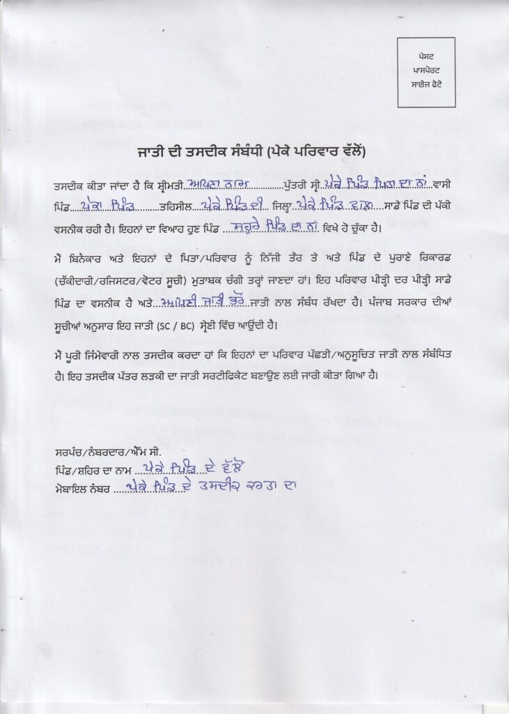 ਜਾਤੀ ਸਰਟੀਫਿਕੇਟ ਬਨਵਾਉਣ ਲਈ ਸਰਪੰਚ ਦਾ ਤਸਦੀਕ ਕੀਤਾ ਪੱਤਰ