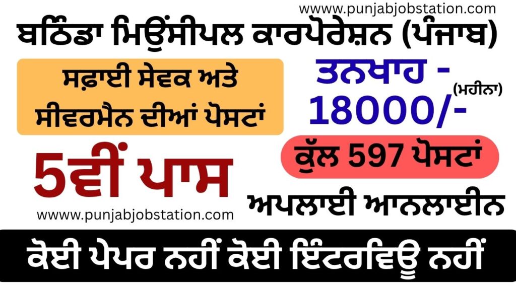 Short Note: The Bathinda Municipal Corporation (Punjab) has announced a recruitment drive for 597 Positions, Comprising 538 Safai Sewak and 59 Sewrman Posts, The Application Window open form 22 September 2025 t 4 November 2025. Interested Candidate which are Complete the Eligibility cafeteria can apply online via Official Website of the Muncipal Corporation. More information given below: